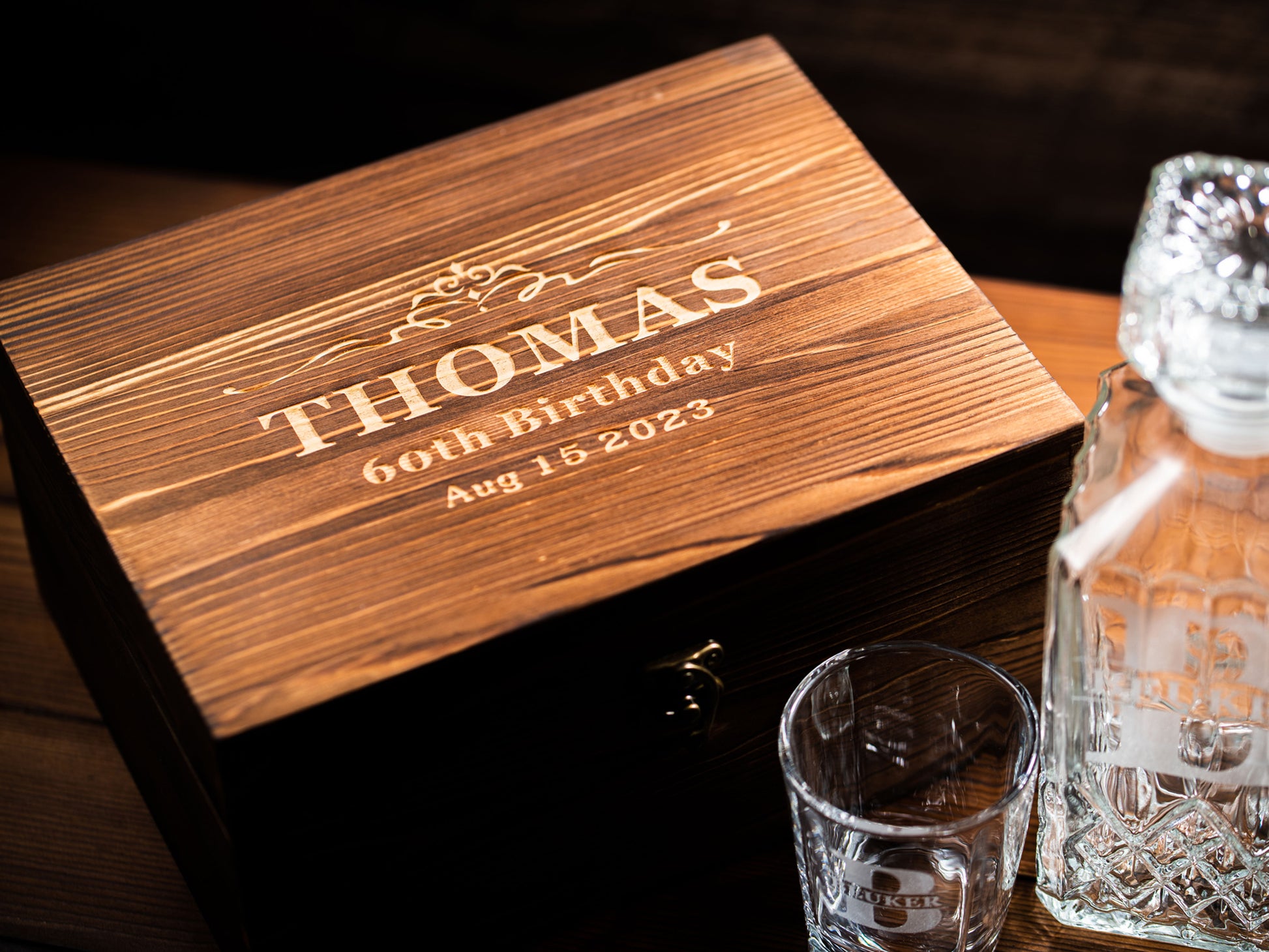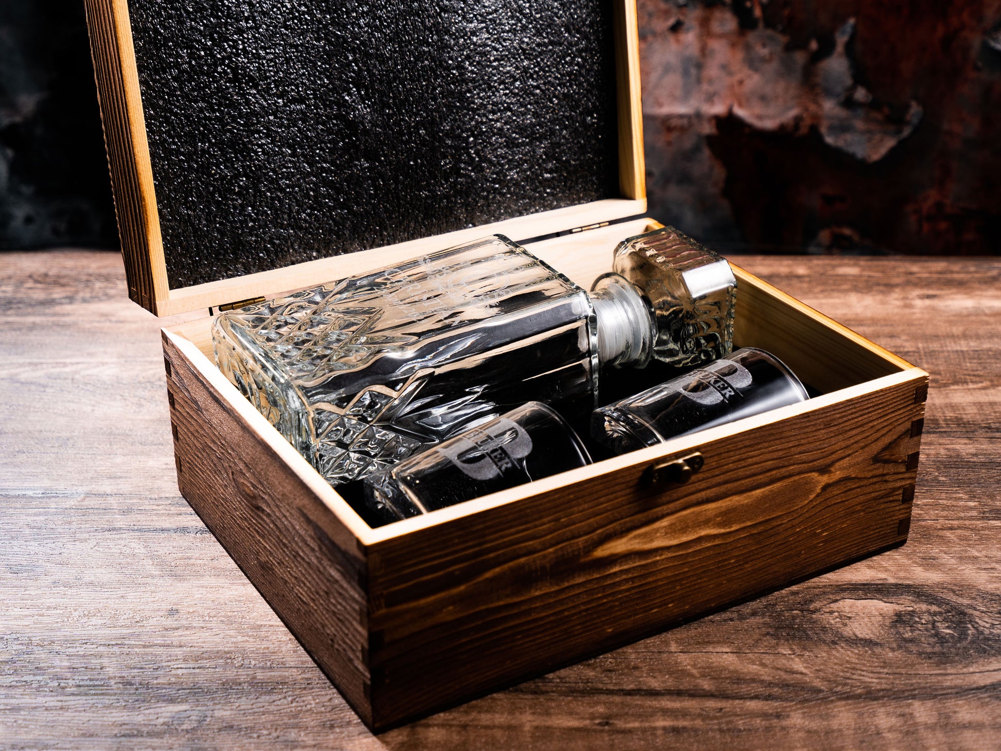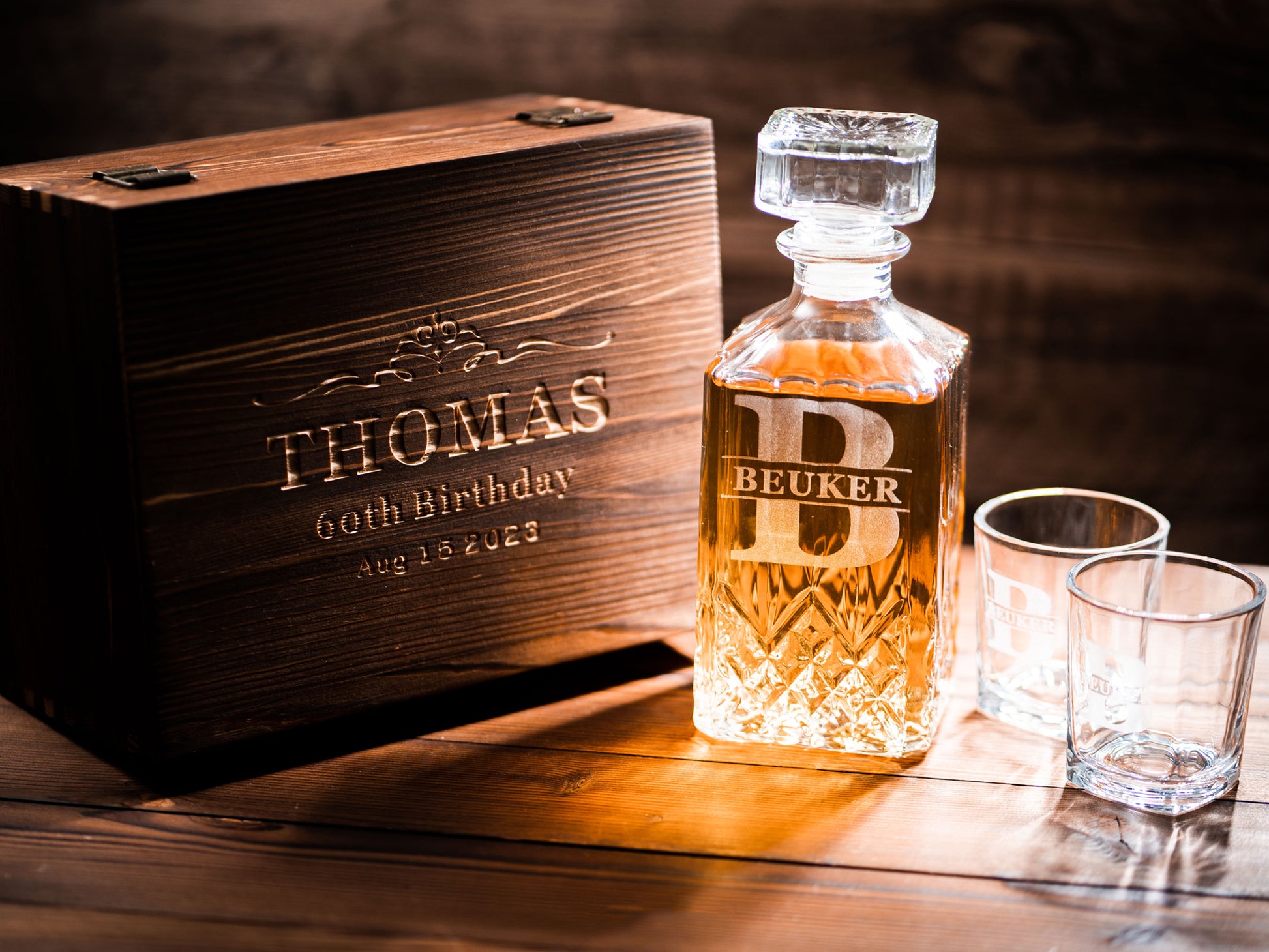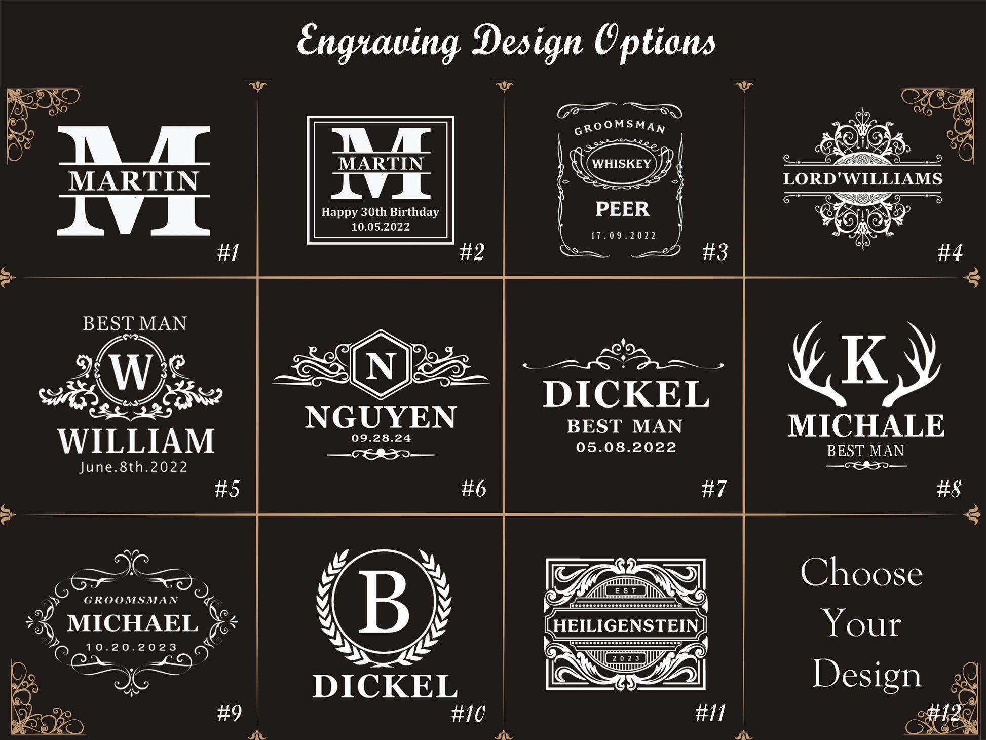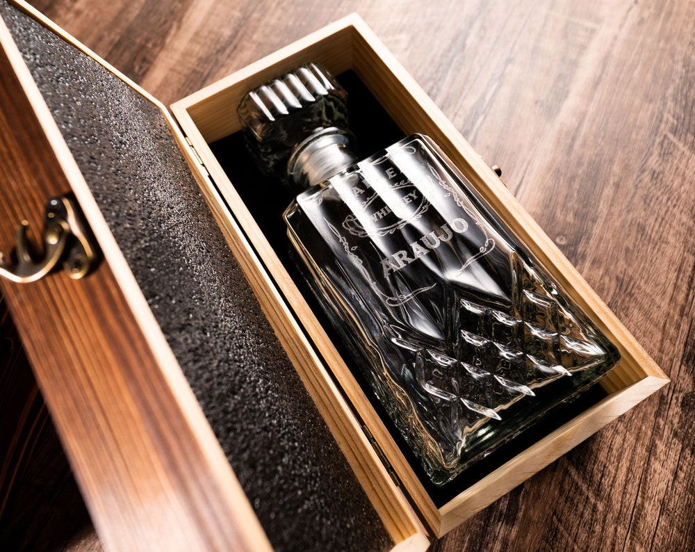 This engraved decanter set is made of high-quality crystal glass, diamond-like detailing for texture and brilliant refraction, makes an elegant addition to your dinner table or home bar. Perfect for any Bourbon, Whiskey, or Scotch lover! Makes a great Groomsman gift, Father’s day gift, Birthday gift, or Housewarming gift for your loved ones!