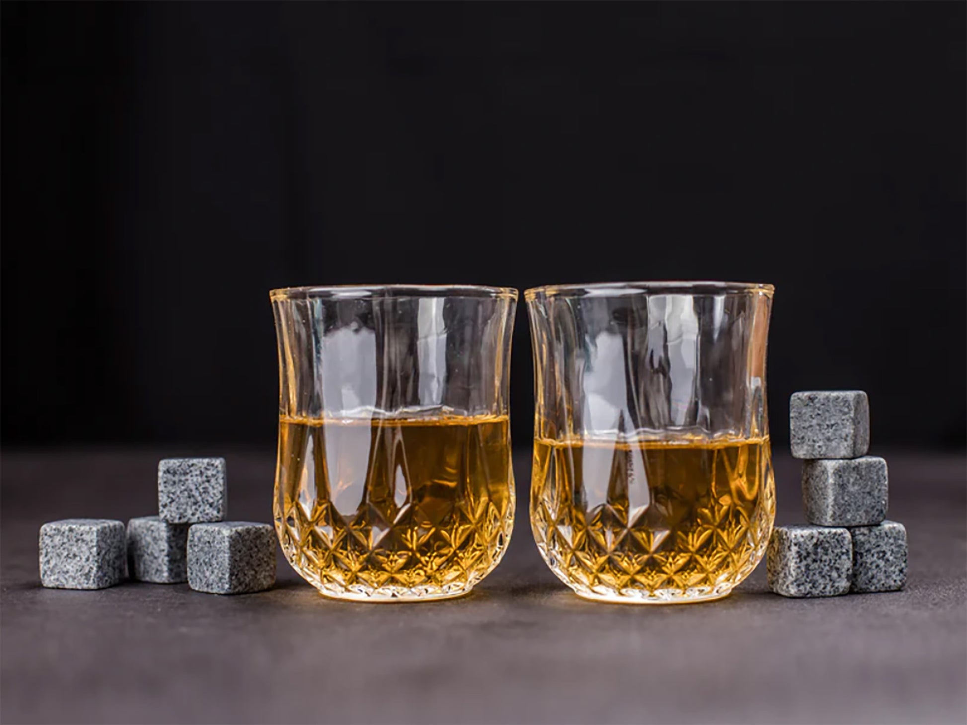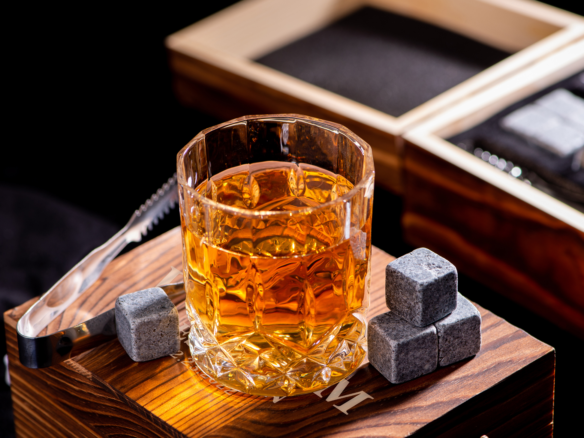 2 Glass Set: Include 8 granite whiskey stones, 2 whisky glasses, 1 flannel bag, and 1 wooden gift box.