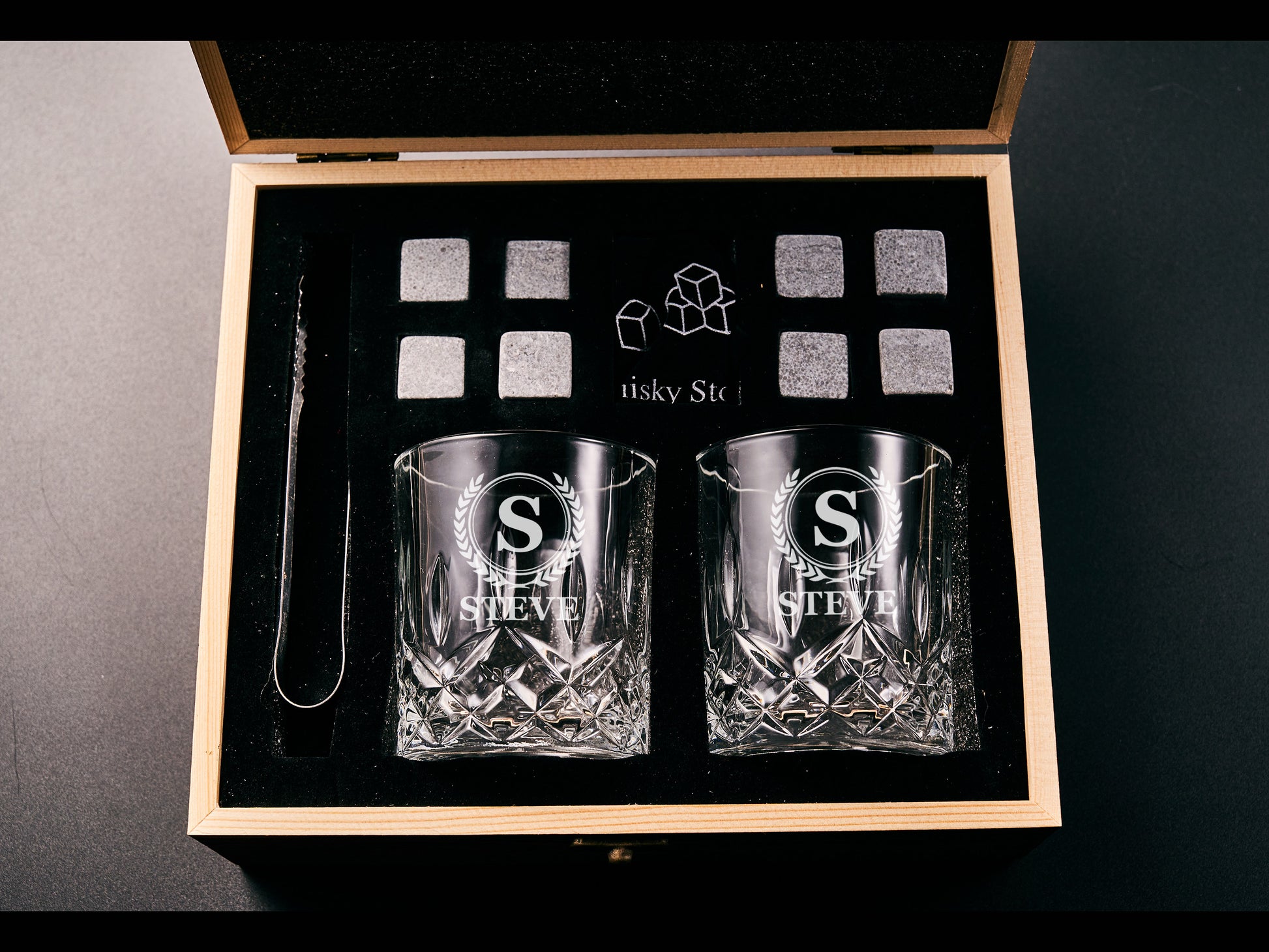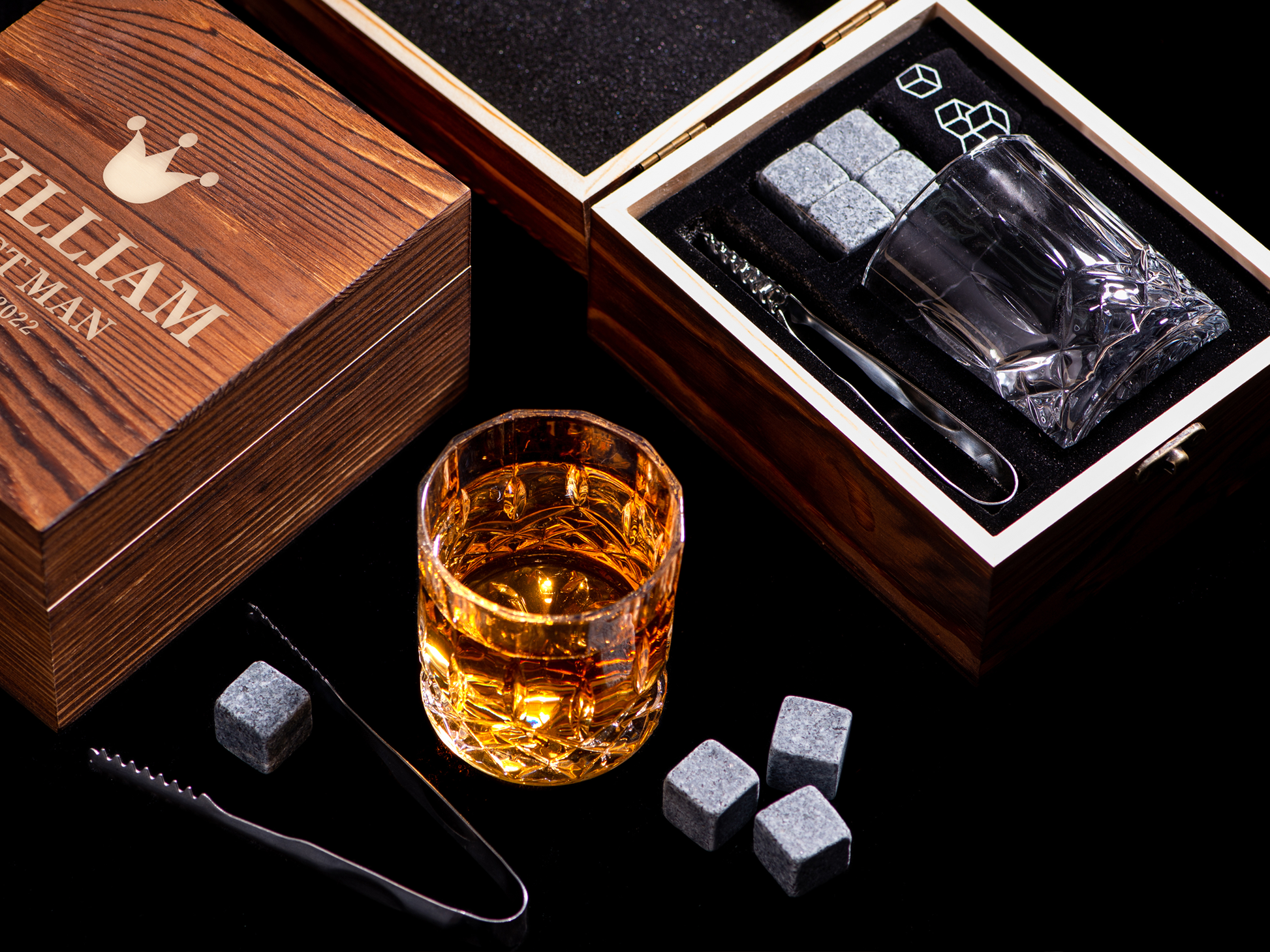 This engraved whiskey glass set is made of high-quality crystal glass. This whiskey glass comes with cooling stones and customized wooden box. Perfect for any Bourbon, Whiskey, or Scotch lover! Makes a great Groomsman gift, Father’s day gift, Birthday gift, or Housewarming gift for your loved ones!