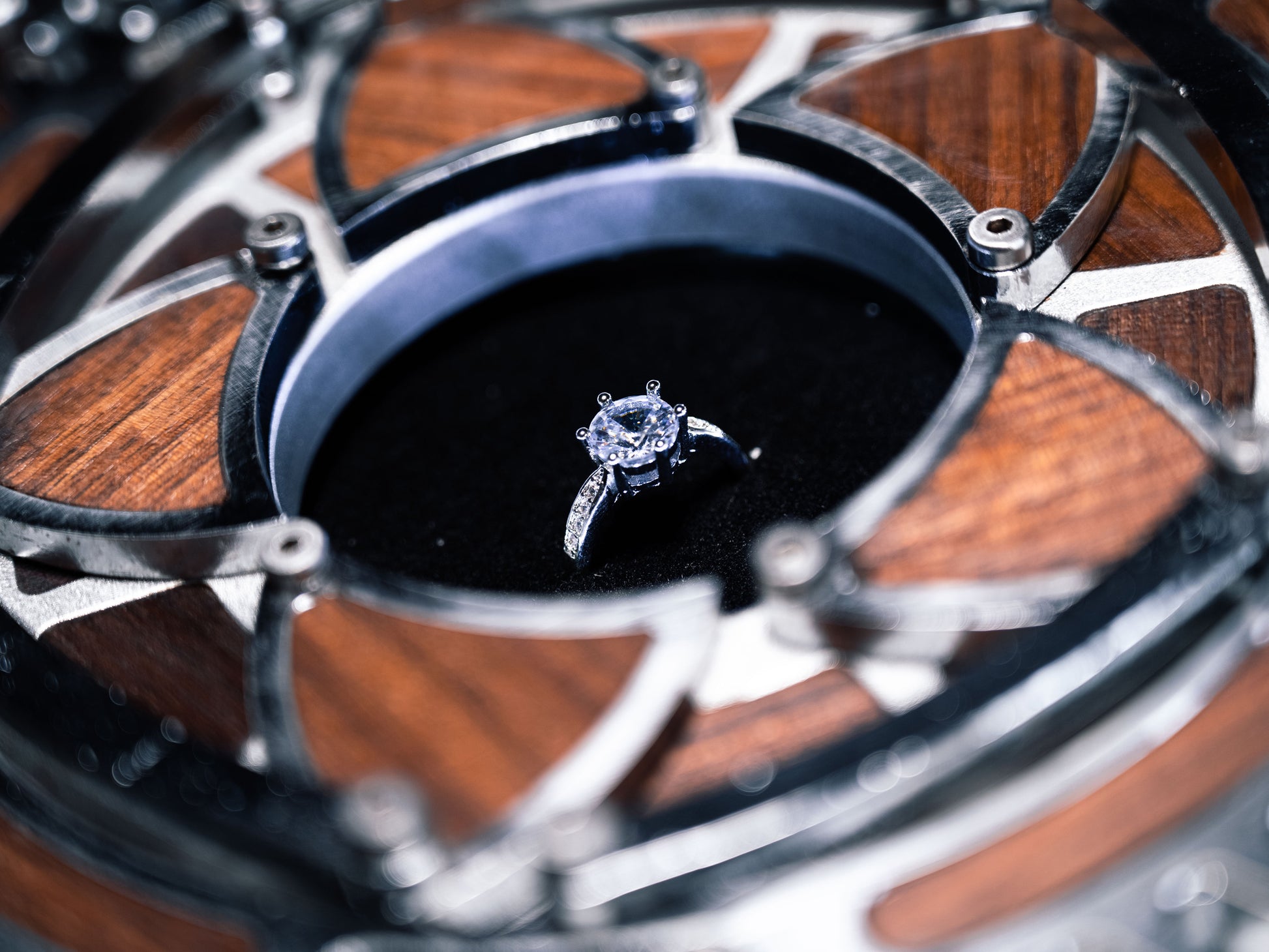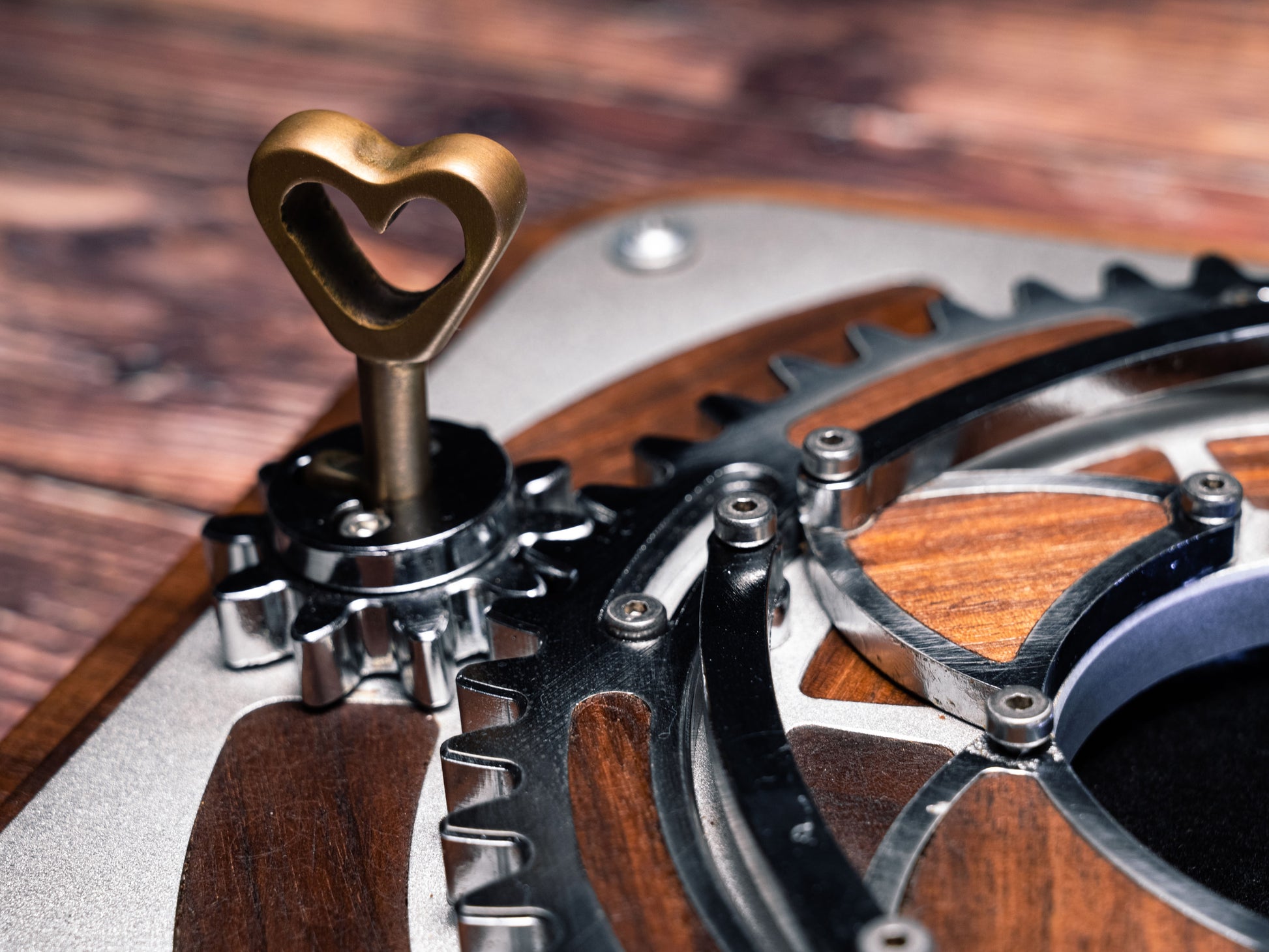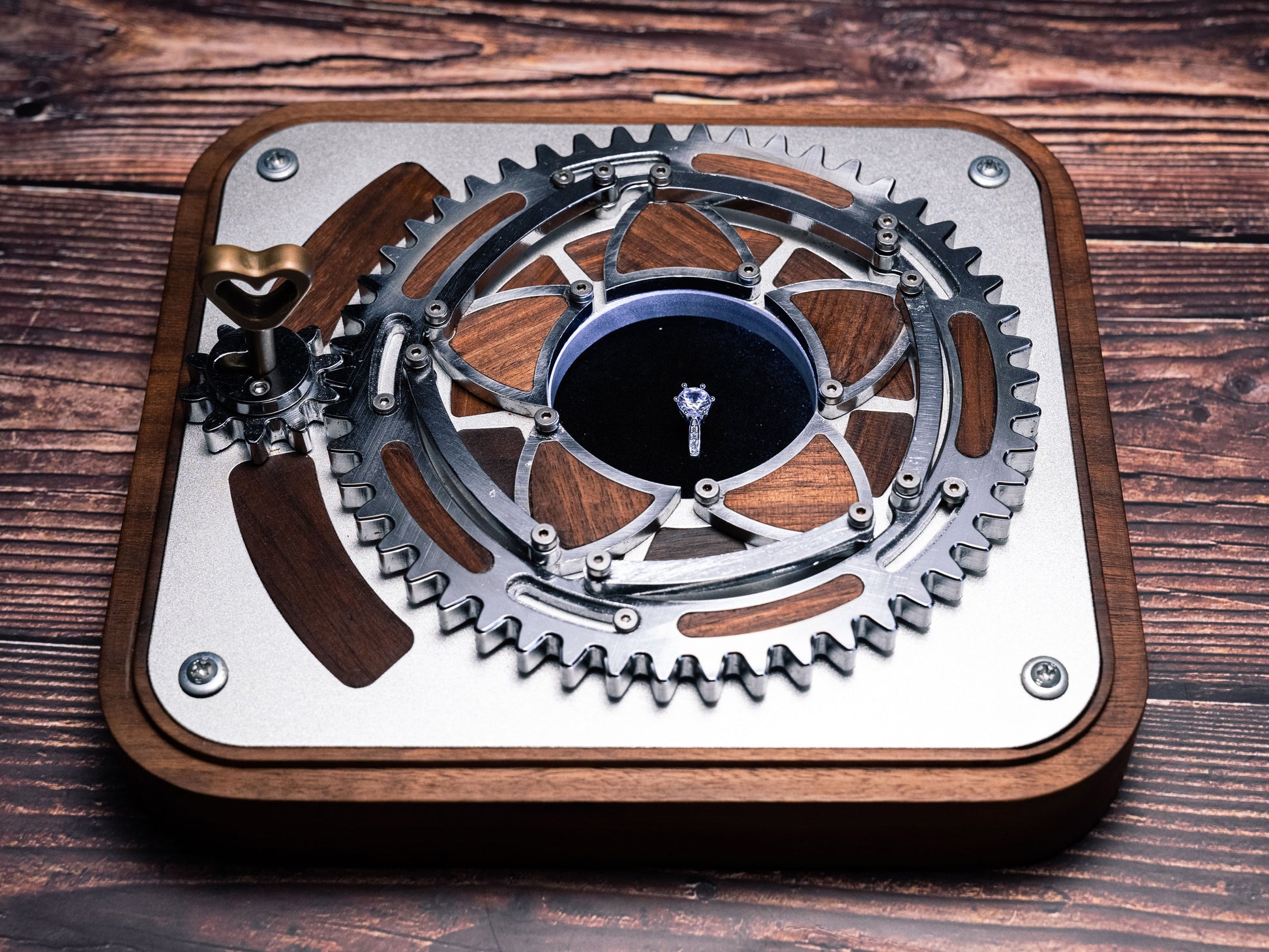 Celebrate your love with a handcrafted solid wood with machined aluminum ring box, designed to add a natural, timeless elegance to your most cherished occasions. Gently turn the heart-shaped key, and the top mechanism of the box opens like a blossoming flower.
